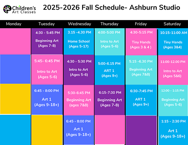 Our Ashburn art studio provides a diverse selection of art classes tailored to various age groups and skill levels: